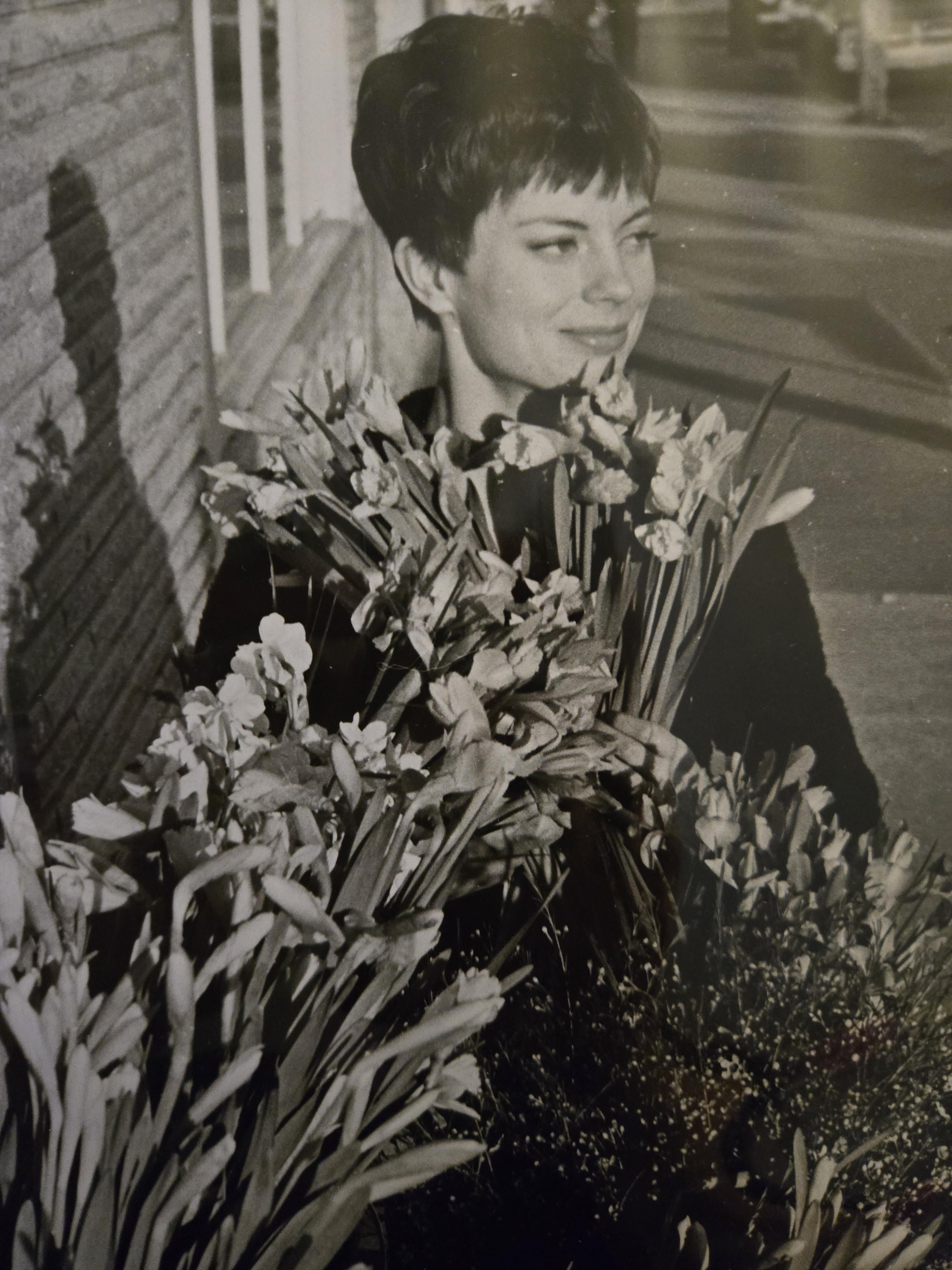 Yesterday was my mom's 80th birthday. She brought a newspaper clipping with this photo of her from 60 years ago. She had just been to the hairdresser to get a "Vidal Sassoon" cut. She was walking home when a photographer from the local (Victoria BC Canada) newspaper asked to take her pictures with the flowers outside a shop.