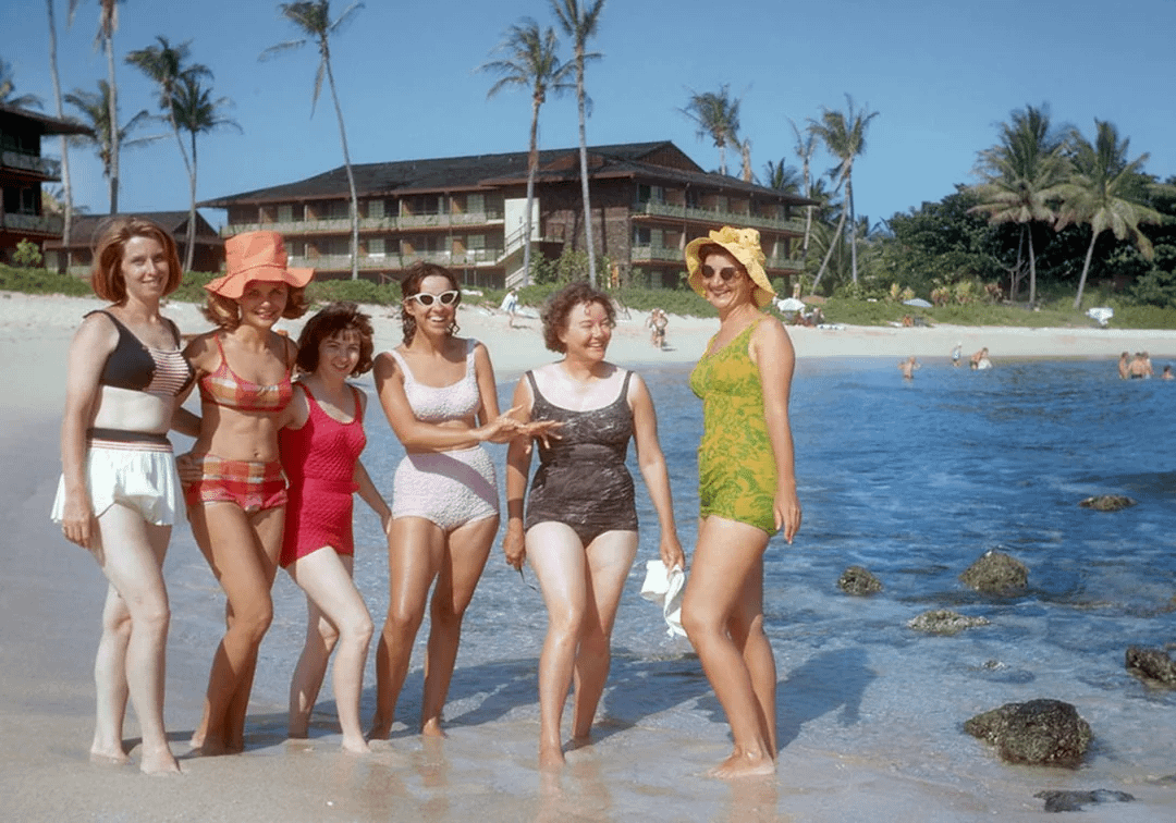 A group of women at Poipu Beach in Kauai. Hawaii, 1950’s.