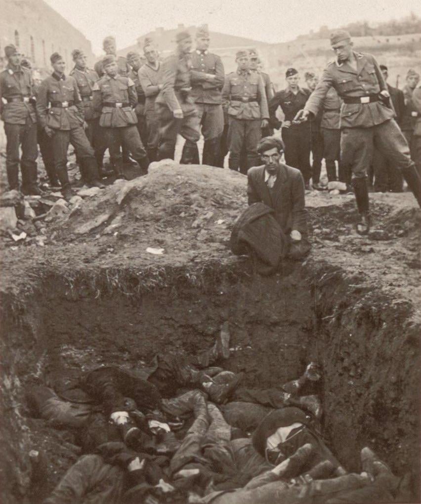 >In 2023, Jürgen Matthäus of the United States Holocaust Memorial Museum discussed the image in an article in the journal Holocaust and Genocide Studies, based on an alternative print from the same negative found in the diary of Walter Materna, an Austrian captain in a Wehrmacht pioneer unit attached to Army Group South, then deployed to the Ukrainian city of Berdychiv,[1] about 90 kilometres (56 mi) north of Vinnytsia in Zhytomyr Oblast.[13][14] This print has the handwritten caption “Late July 1941. Execution of Jews by SS in the Berditschew citadel” on its reverse.[1] The print has finer detail and the uncropped image includes a number of additional soldiers to the left, and a building in the background.[1] Matthäus’ article reproduces another photograph, possibly of the same event from a different angle, published by the Archive of Modern Conflict in an album of Wehrmacht sergeant Heinz Baier, which also mentions Berdychiv.[1][15] Materna’s diary for 28 July 1941 in Berdychiv tells of hearing from other Germans at the citadel that about 70 Jews were shot that day (and one “Aryan”, a trainee political commissar) after 180 and 300 killed on the previous two days.[1] After the victims were shot and fell into the mass grave, another SS-man machine-gunned them to ensure death.[1]