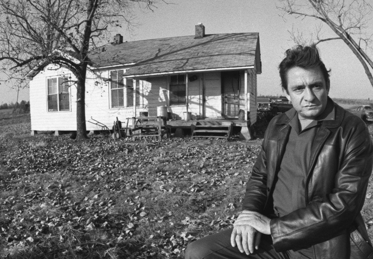 Johnny Cash poses outside the small house he grew up in near Dyess, Arkansas, circa 1968. The son of impoverished cotton field workers, he often labored alongside his parents in the fields as a boy.