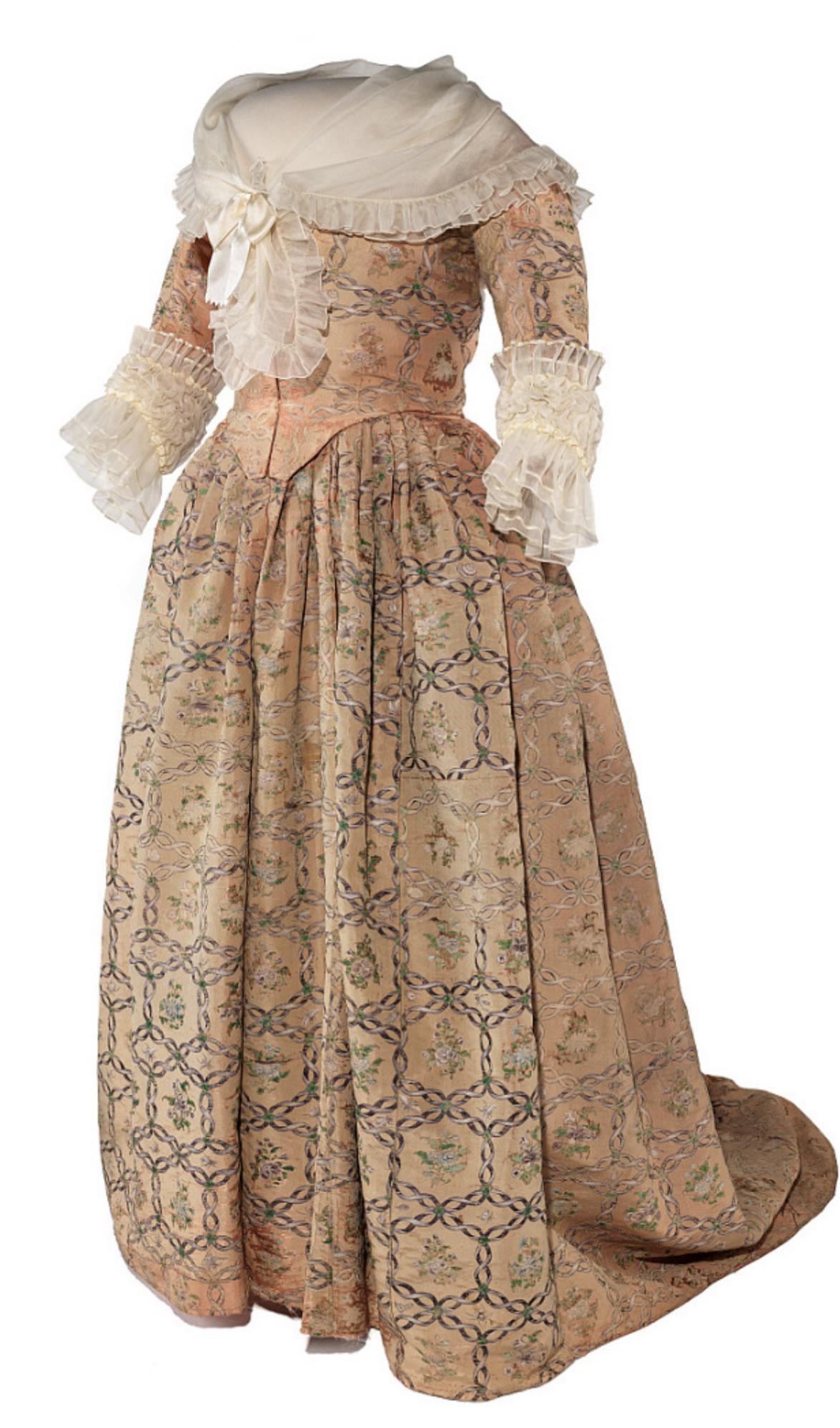 Dress worn by Martha Washington. The gown's basic style is typical of the early 1780s. The painted pattern on the silk taffeta is a repeat of four floral bouquets and 58 creatures (butterflies, ants, beetles, snails, bees, grasshoppers, wasps, ladybugs, spiders, and grubs) places within the spaces between the ribbon-trellis pattern. Each crossover is accented with a painted green "jewel." The fabric displays characteristics common to 18th-century hand-painted Chinese textiles: fluid brush strokes, white lead base coat of paint, green malachite pigment for the "jewels," and a 30-inch selvage-to-selvage width.