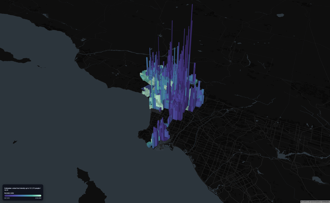 Tools: I pulled 2023 ACS tract-level population and median household income for Los Angeles County, clipped the tract geometries to Los Angeles City, and computed tract density from population divided by tract land area. The 3D map was built in Python with GeoPandas and pydeck/deck.gl, using tract height for population density and a color ramp for median household income.
