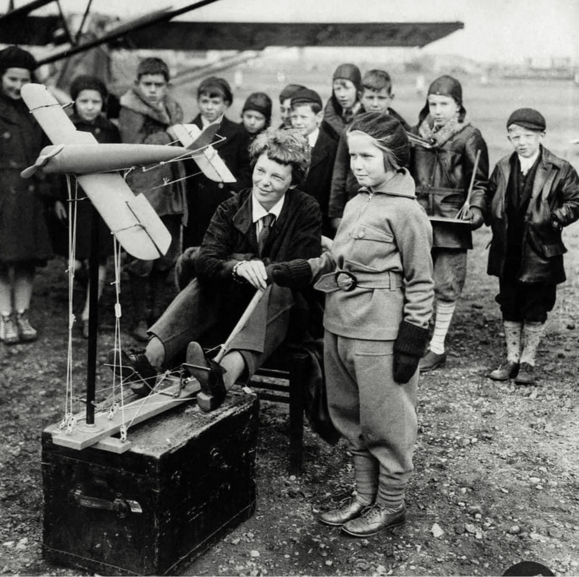 Amelia Earhart teaching aviation using early, rudimentary flight simulators that show how to handle navigation, flight controls, 1933 by eaglemaxie