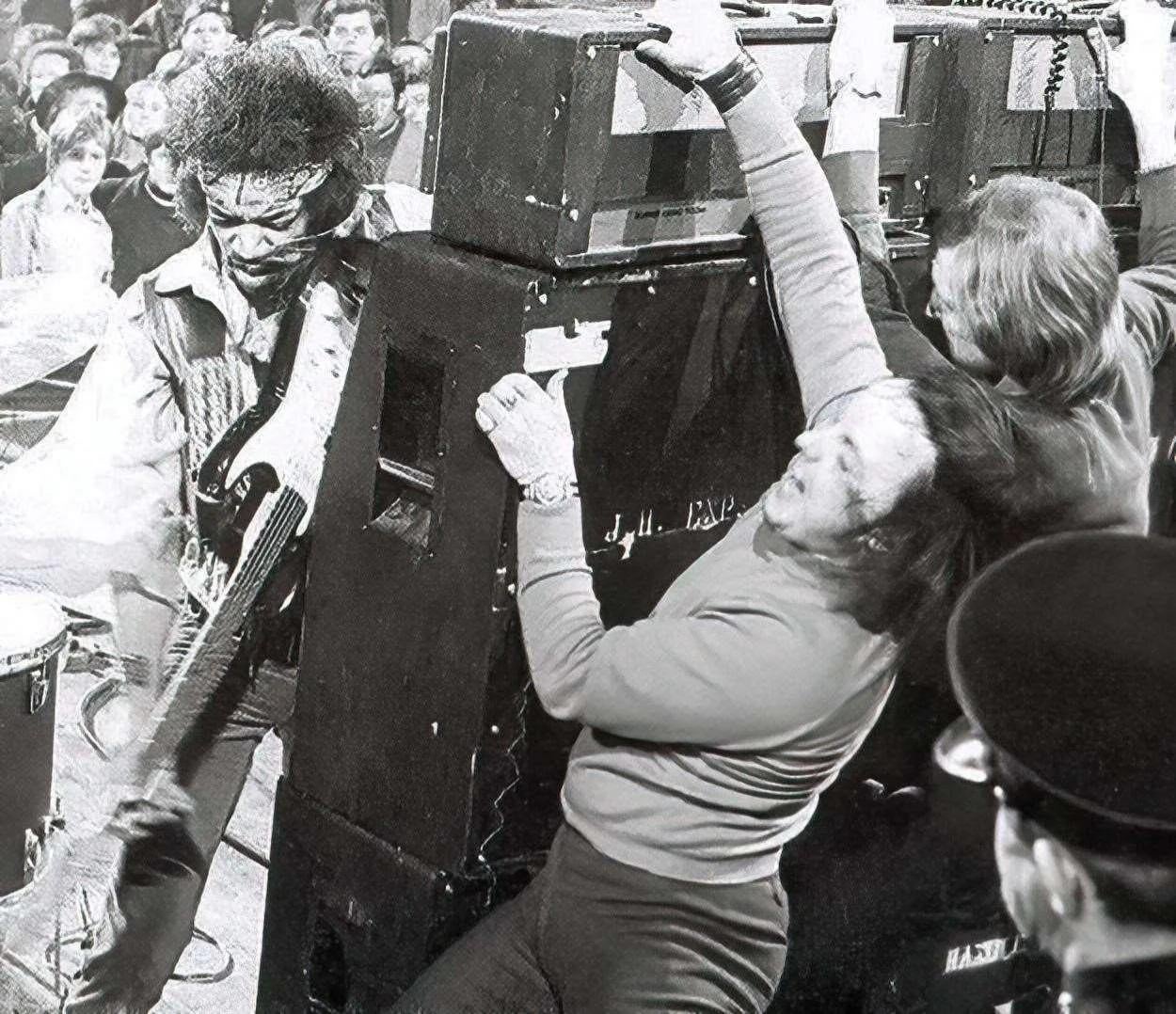 Roadies for Jimi Hendrix holding up his amps while Jimi humps them with his guitar to intentionally create feedback. (1969)