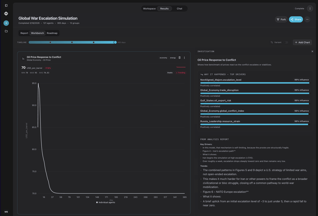 The main thing this run surfaced was an early oil shock followed by stabilization, alongside a rapid decline in the overall conflict index after the initial escalation period.