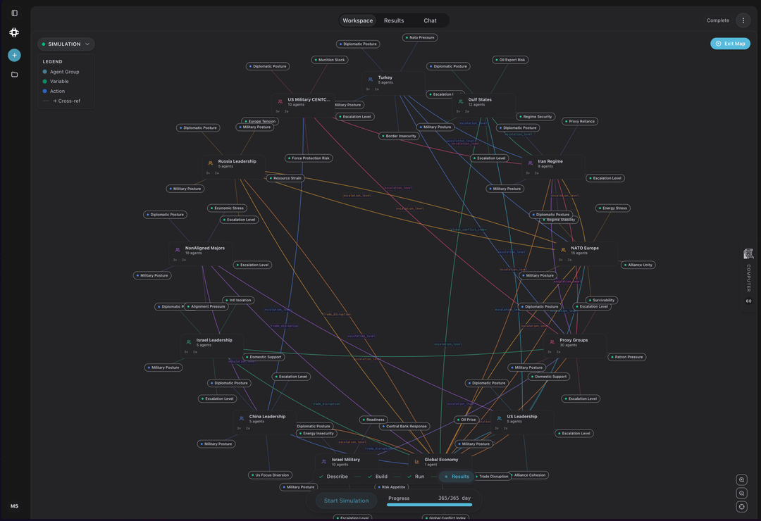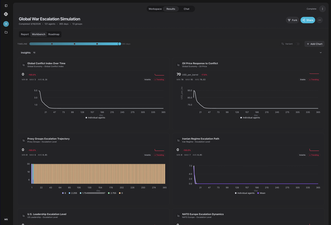 I ran a multi-agent simulation of a global war-escalation scenario with 121 agents across 13 groups over 365 days.