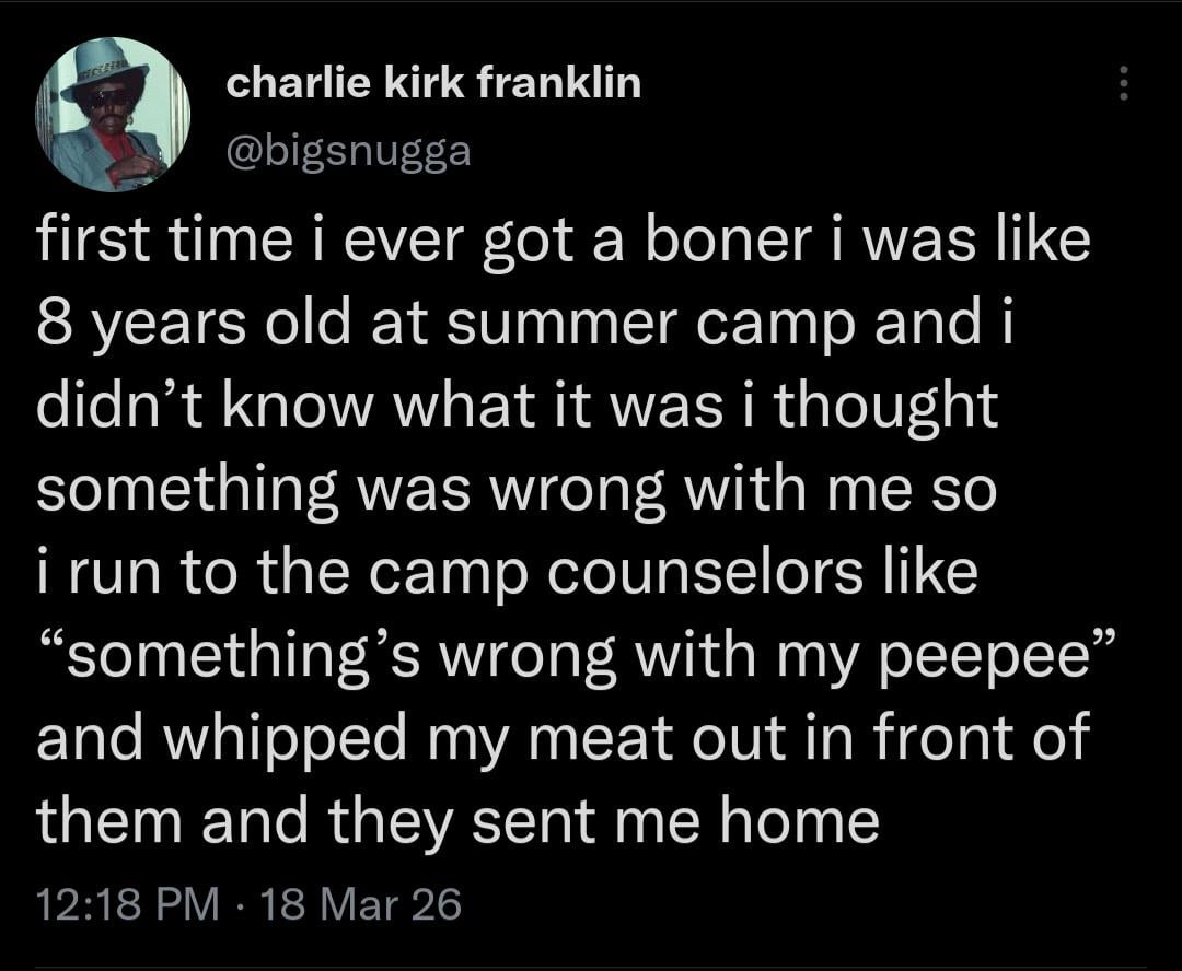 ShaqSenju on March 18, 2026 10:58 pm I had to have that talk with my girl’s nephew randomly in a movie theater bathroom. He was crying at the urinal lmao “Everything ok over there buddy?” “No 🥺 my wee wee won’t go down.’ “Huh?? It won’t go down??””