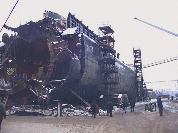 Kursk nuclear submarine’s wreck at the dry dock in the northern Russian port of Roslyakovo, October 29 2001.[600×449] by myrmekochoria