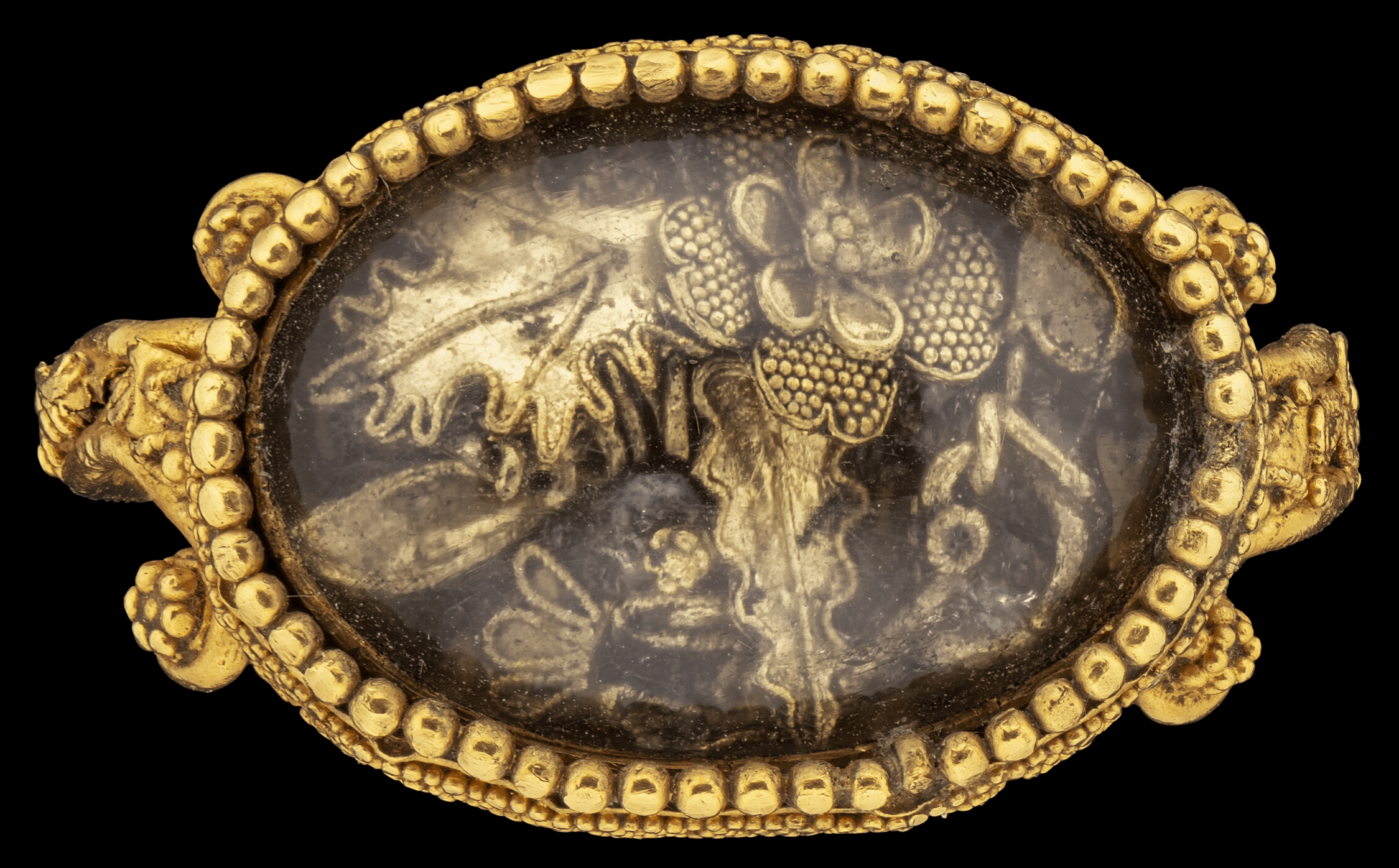 1. Crafted around 150 BCE, the elaborate Hellenistic gold ring boasts an oval, box-shaped bezel, holding a large domed rock crystal through which can be seen a beautiful garden scene of miniature gold and enamel flowers and filigree oak leaves.