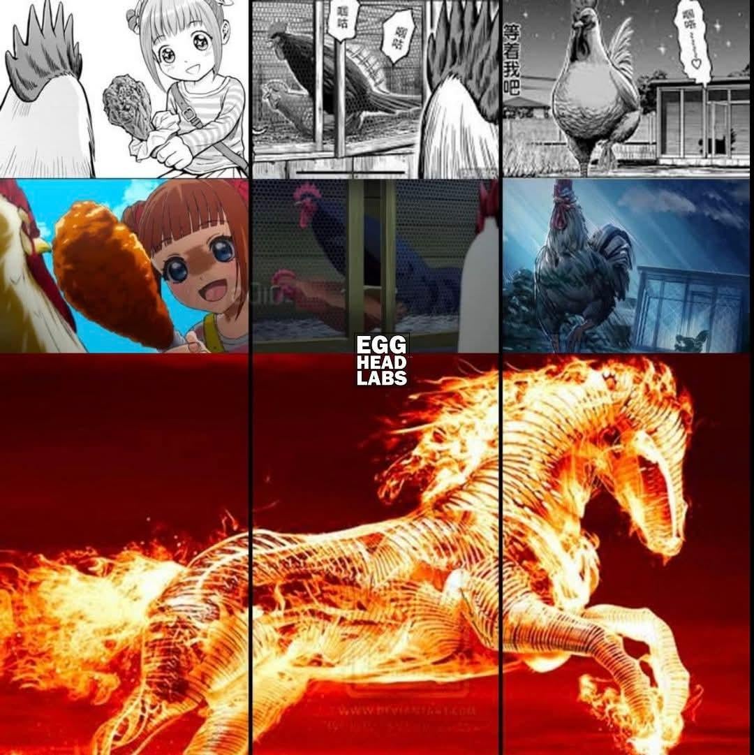 Honestly, that girl’s gaze in the second panel terrifies me more than the entire bottom half of the meme. Run, chickens, run