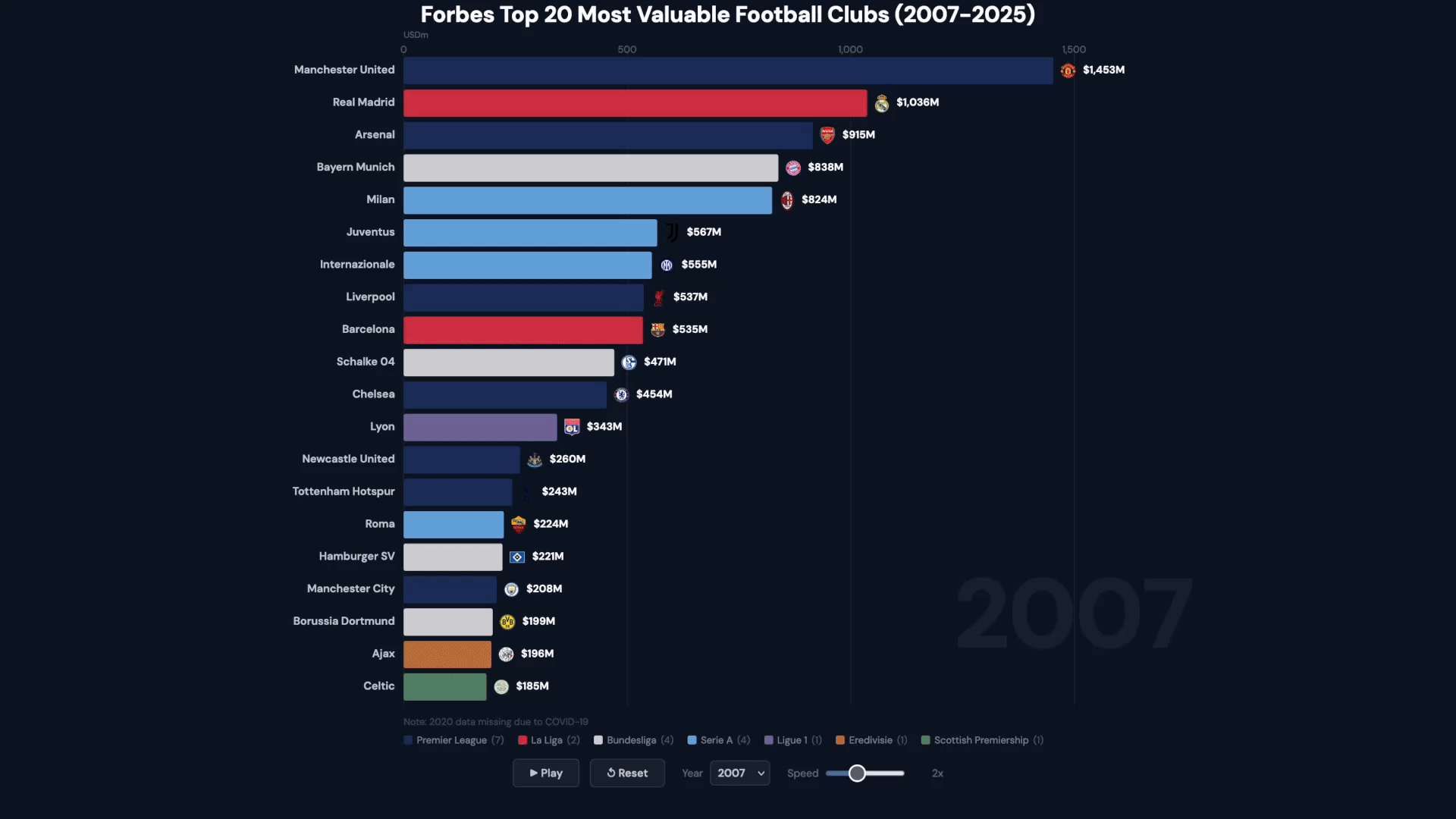 This’d be easier to follow if the colours reflected the clubs (Man Utd = red, R. Madrid white, Man City sky blue etc)