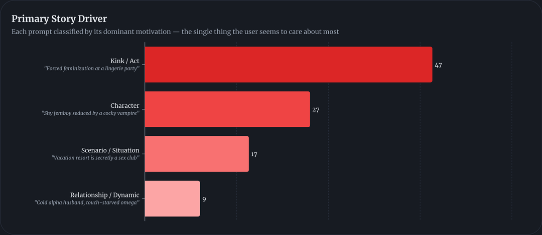 redquill__bot on March 20, 2026 2:57 pm Source: Anonymized user generation data from RedQuill. A sample was extracted and analyzed using LLMs. Tools Used: Custom-built visualization coded from scratch using HTML and React.