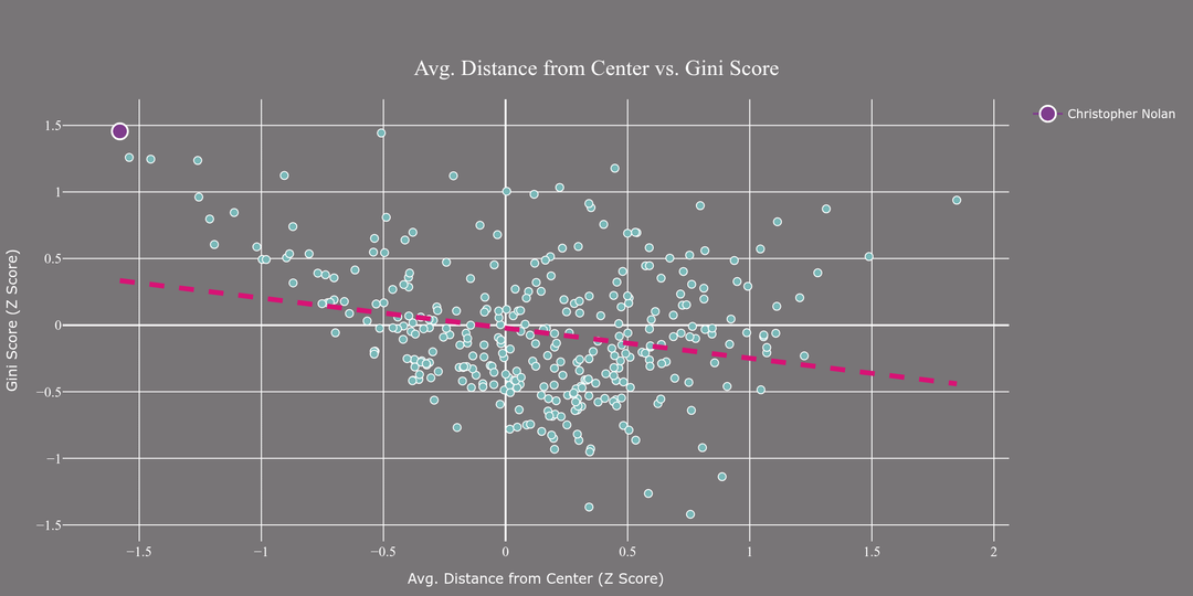 3) This plot measures the average distance of a face to the center of the frame against the "Gini" score (It’s a measure of how evenly faces are distributed across a 3×3 grid. A Gini score of 1 would mean that all faces are concentrated in a single cell and a score of 0 would mean that the faces are distributed perfectly equally across the grid.) Nolan is top on Gini score and bottom on distance to center. What does this mean? Nolan likes to center his compositions.