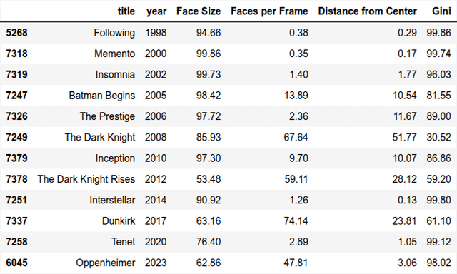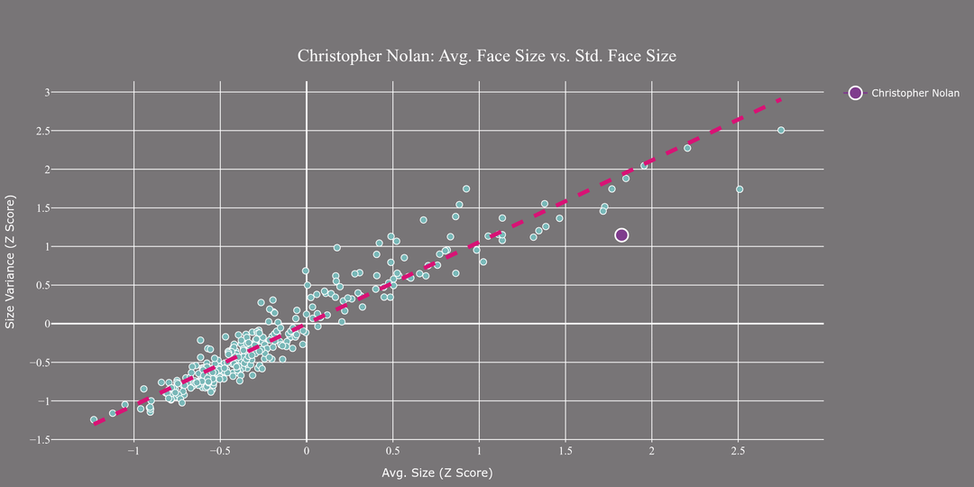 I examined how Christopher Nolan frames faces in his films using a variety of statistical measures (face scale, face density, distance to center, Gini score) to determine how Nolan's compositions relate to other directors. There are over 300 directors in the sample from over 6,000 films. To be included, a director must have five films in the sample. A full list of the directors can be found here.