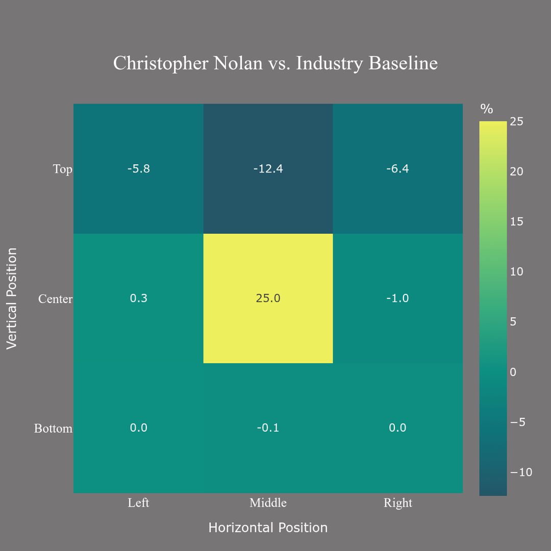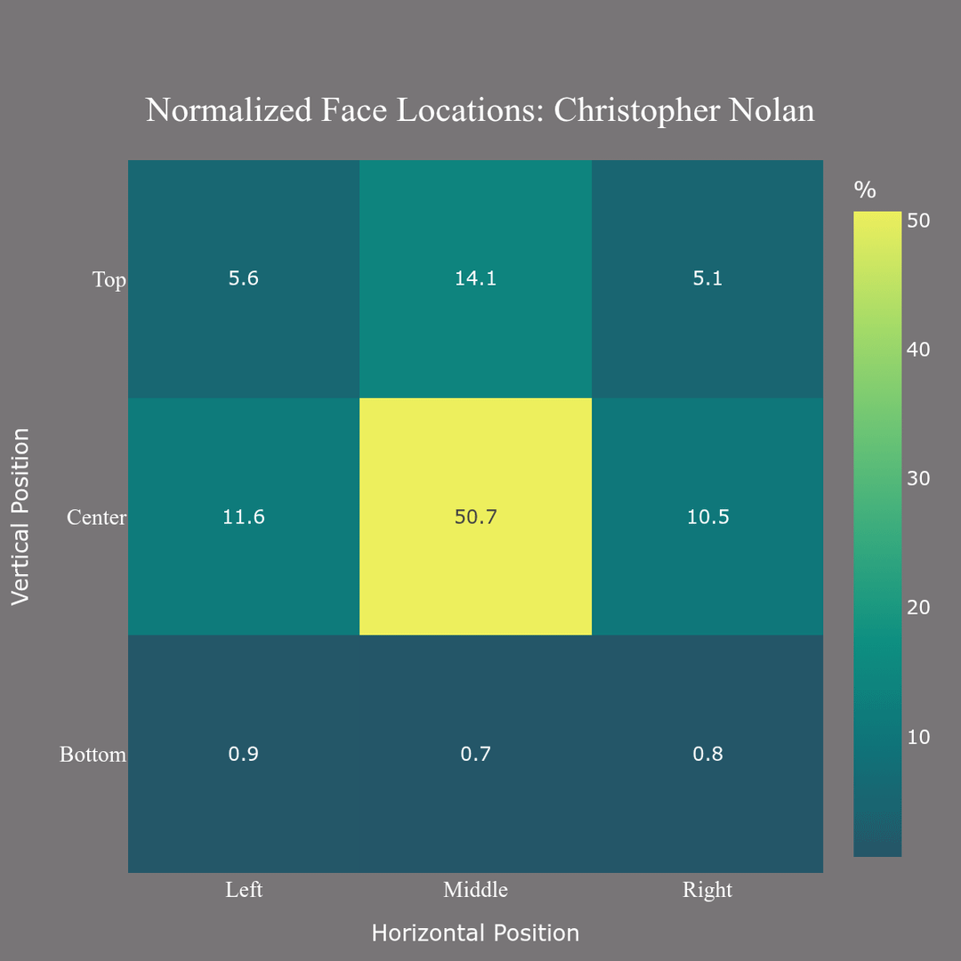 4, 5) This is the 3×3 grid Gini is calculated from. As you can see, Nolan prefers the center of the frame. Half of all faces are located in that cell. If we take the difference between Nolan's grid and that of the overall sample, we see that there is a difference of 25%, meaning that Nolan is twice as likely to place faces dead center than the average director.