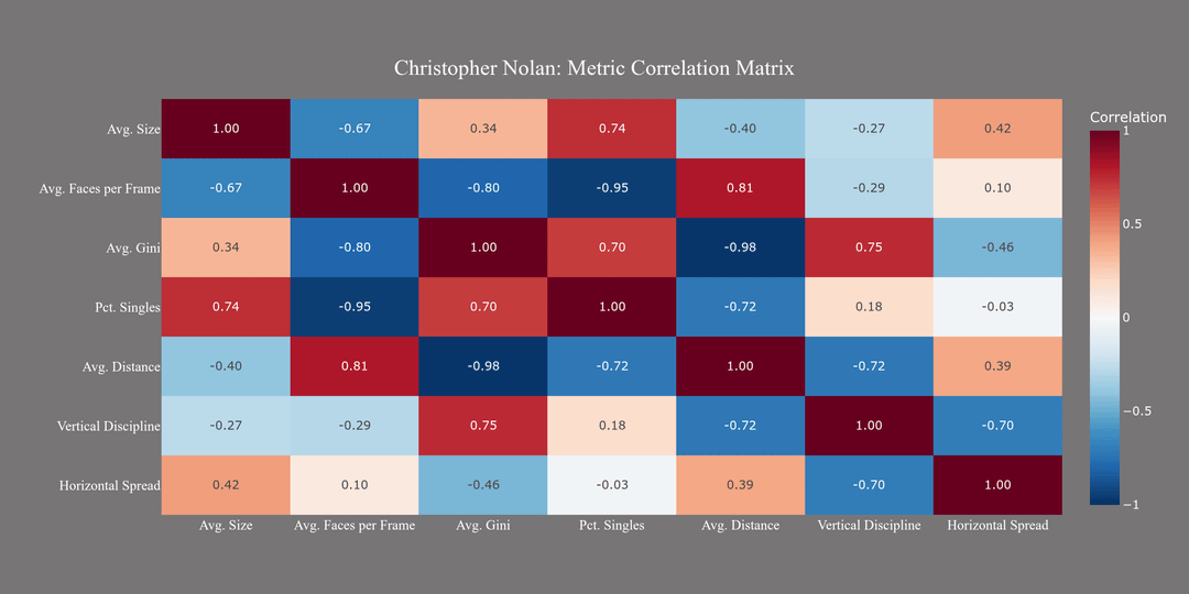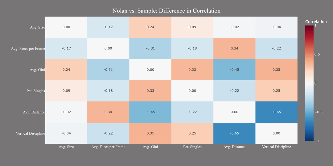 What’s interesting is the difference between these correlations and the rest of Nolan’s peers. While distance and Gini are correlated in the sample, they are not to the same degree as with Nolan. This becomes clear if we take the difference between the two heatmaps. Take the relationship between average distance and Gini score. These variables are correlated in the sample as well (-0.53), but not nearly to the same degree as Nolan (-0.98). The correlation is almost perfectly inverse, again due to Nolan’s extreme preference for the center of the frame. In order to increase the distance, he would have to put the face in a different cell, lowering his Gini score.