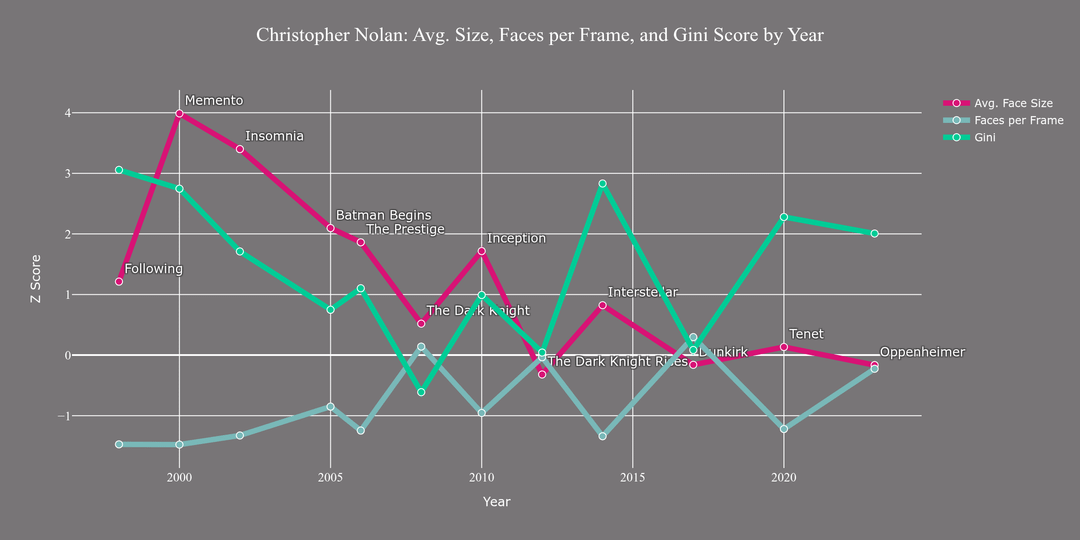 7) Nolan's style has actually changed considerably over the course of his career, particularly average face size. There's been a consistent downward trend that stabilized around the mean. Interestingly, Gini score tracked average face size downward, but then decoupled after The Dark Knight (2008) and has risen in his most recent films (excepting Dunkirk [2017]). Some of this change is due to an increase in the average number of faces per frame. I go more in-depth on the possible causes for this change in my Medium article here.
