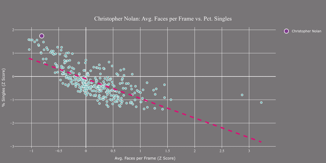 2) This is the average number of faces per frame plotted against the percentage of shots that are "singles" (frames with only one face in them). No director in the sample has a higher preference for singles. Nolan simply does not like to pack the frame with faces. On average faces per frame, Nolan is in the bottom 3.3% of directors.