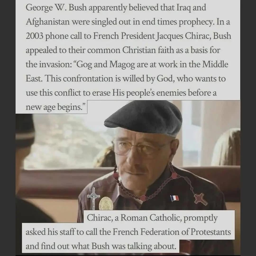 It seems Chirac did have reason to believe that Bush (or his administration) was focused on apocalyptic prophecy and thought Gog and Magog were in play, and he did check with Protestant experts, but we don’t have any actual transcript of such a call and that wording *really* doesn’t sound like Dubya.