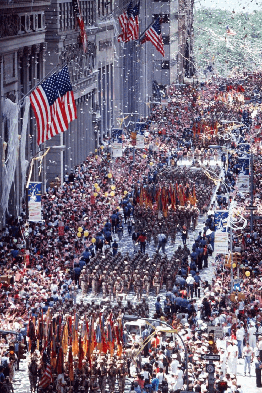 An estimated one million people filled the streets of New York City on June 10, 1991 to celebrate the return of 24,000 U.S. troops from Operation “Desert Storm”. Nearly 700,000 U.S. troops were deployed to the Persian Gulf region as part of a multinational force to free Kuwait from Iraq. [1000×1500]