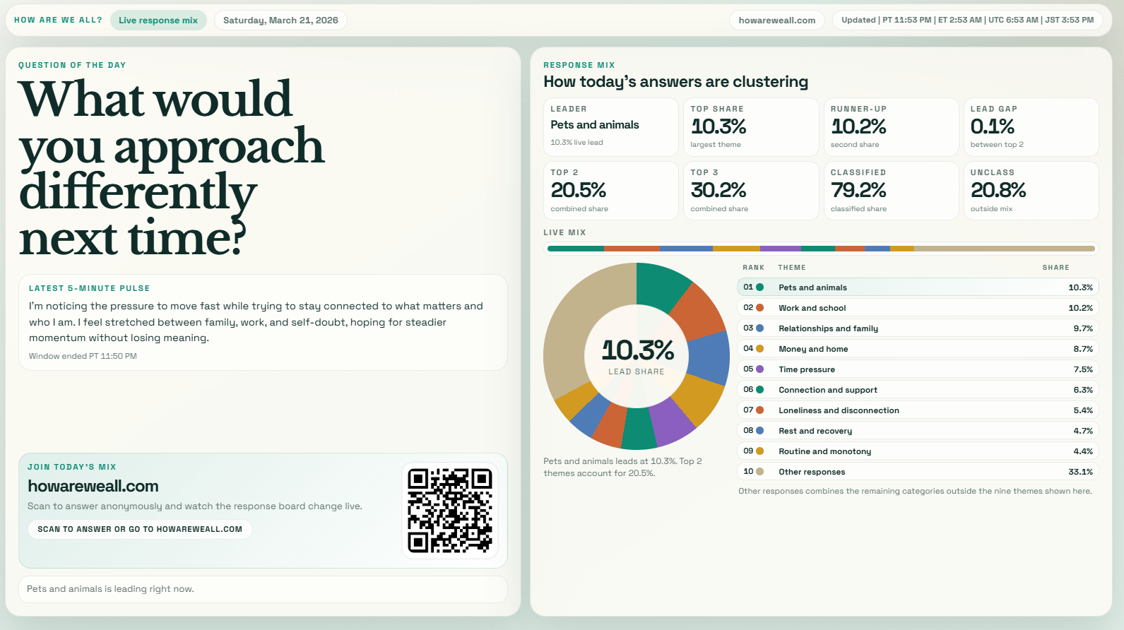 Processing: Responses grouped into themes using a custom clustering approach, then aggregated into percentage shares