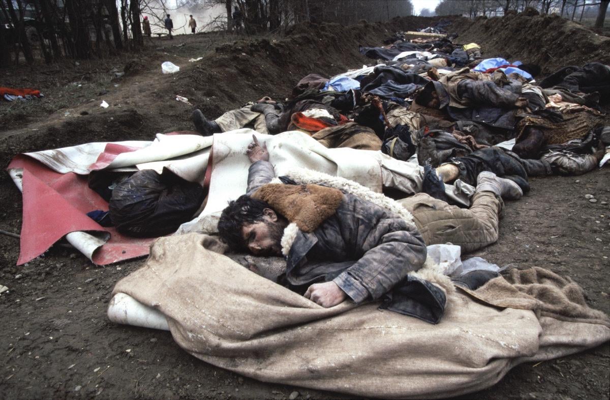 Mass graves at the edge of Grozny where men deposit the hundreds of unidentified bodies found in the city following the Russian invasion and bombardments of December and January 1994-1995.[1200×786]