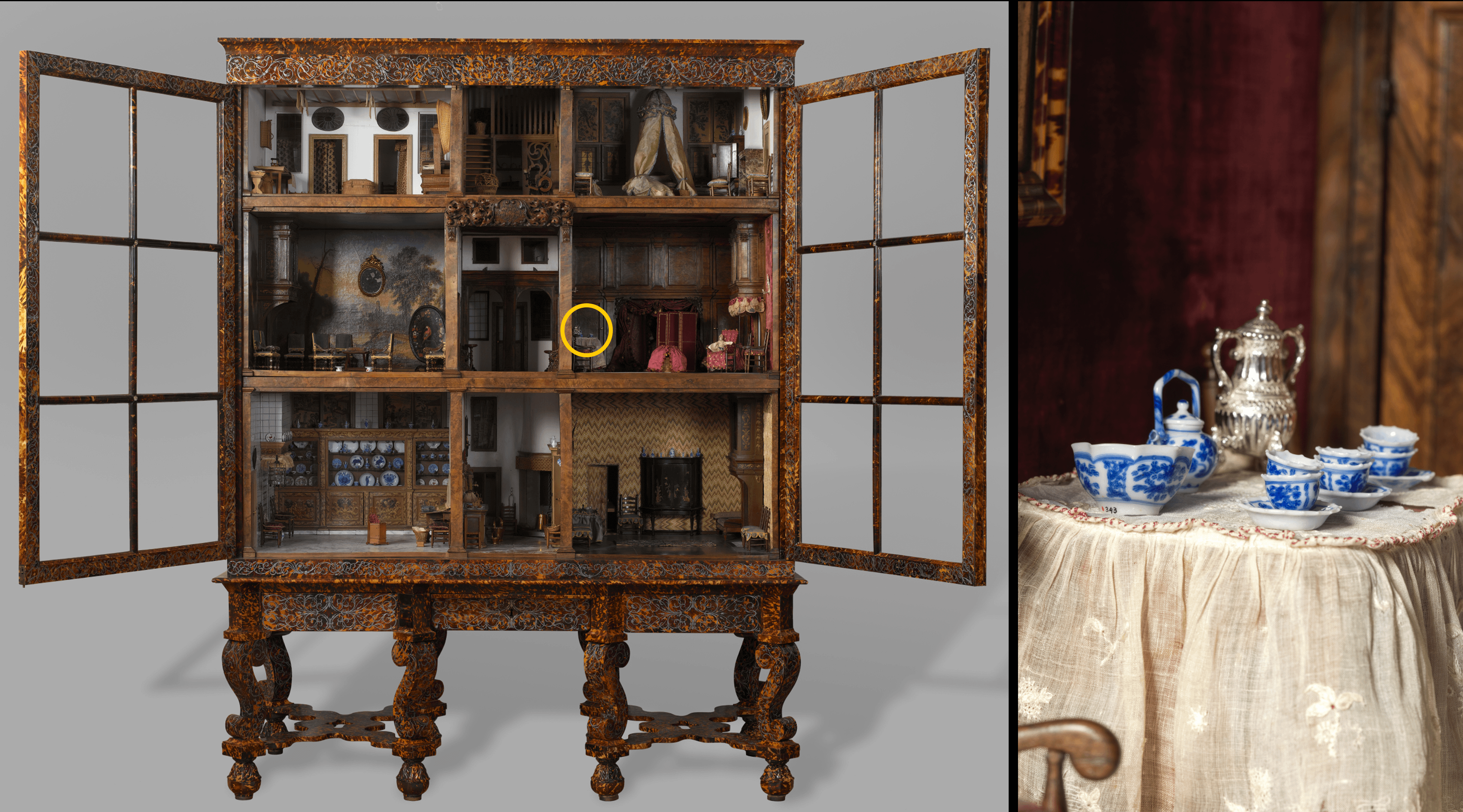 The current state of the rooms is still very much like it was depicted in Appel’s painting, though of the wax dolls*—*”dressed to perfection” only the child in the nursery is left. Also missing are the doll clothes, which were still visible in a photograph from the 1950s. Willem Frederiksz van Royen painted a mural in the game room, and Johannes Voorhout decorated the tapestry room. Porcelain objects were ordered from China. Zacharias von Uffenbach noted in 1718 that it was the most valuable dollhouse in Europe, at between 20,000 and 30,000 guilders.