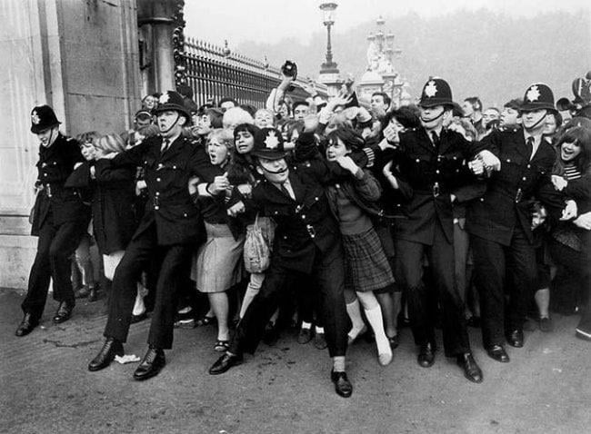 Police officers struggle to contain a crowd of fans gathered outside Buckingham Palace, where The Beatles held an audience with Queen Elizabeth II. London, October 26, 1965. [650×478]
