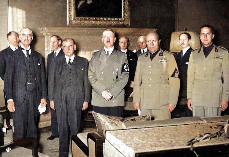 Chamberlain, Daladier, Hitler, Mussolini and Ciano before signing the Munich agreement colorized (1938) [800×548]
