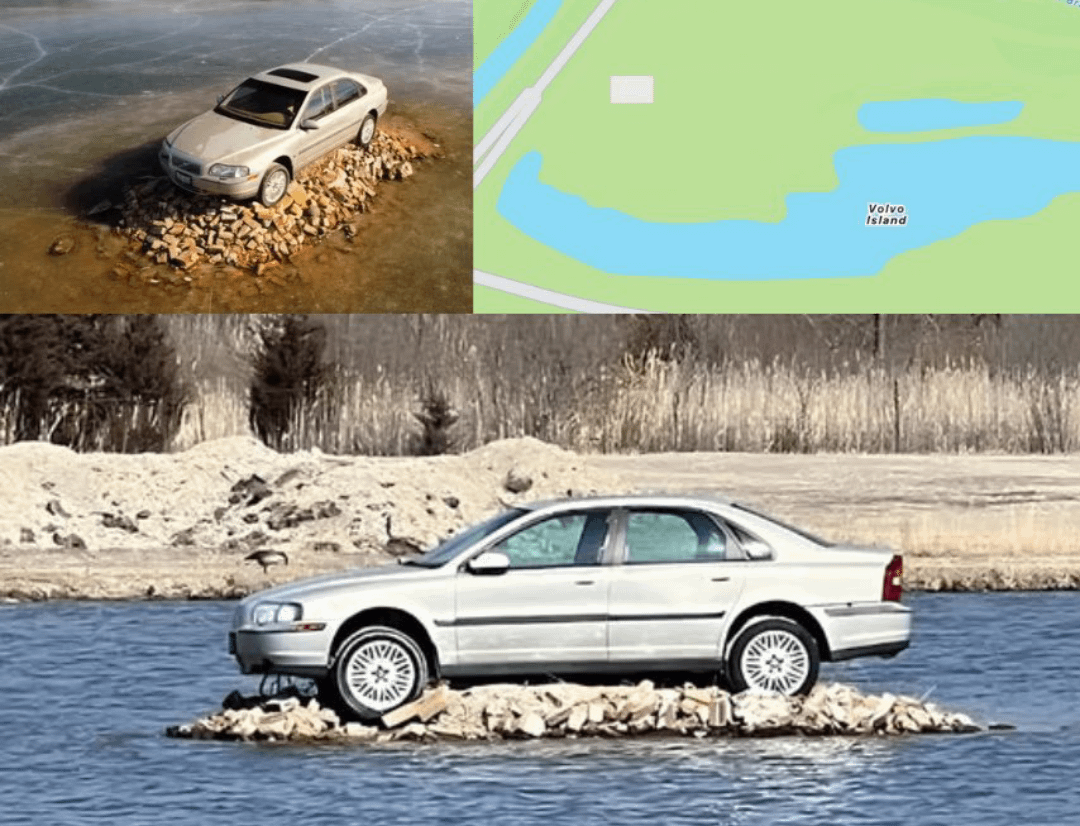 In Ottawa, Illinois there’s an abandoned Volvo that’s been stranded on a small rocky island since 2012. It’s even marked on Google Maps as “Volvo Island.”