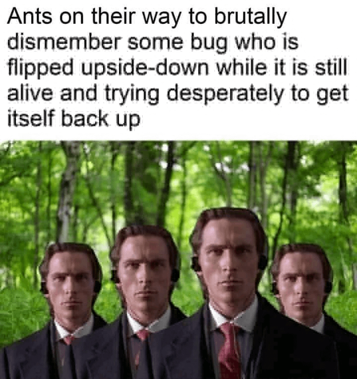 Been playing alot of “Empires of the Undergrowth” recently and this meme is very fitting. I do love spamming fire ants just to devour some lowly beatles and the occasional spider who gets too cocky!