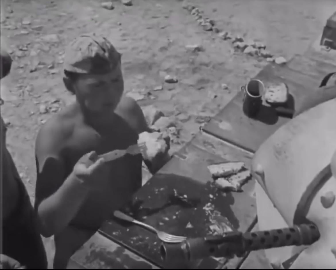 German soldier eating a fried egg off the hull of a Panzer medium tank – from the Deutsches Afrikakorps – in Libya – during the Western Desert Campaign, c. 1941 – 1942. [1170 x 941]