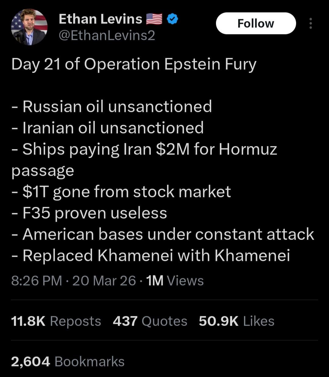 The F35 bit isn’t true, but the rest more or less is accurate. Pretty fucked, but nevermind the actual cost to the American taxpayer, lives lost for ZERO reason, and dead civilian children by the literal building-load.