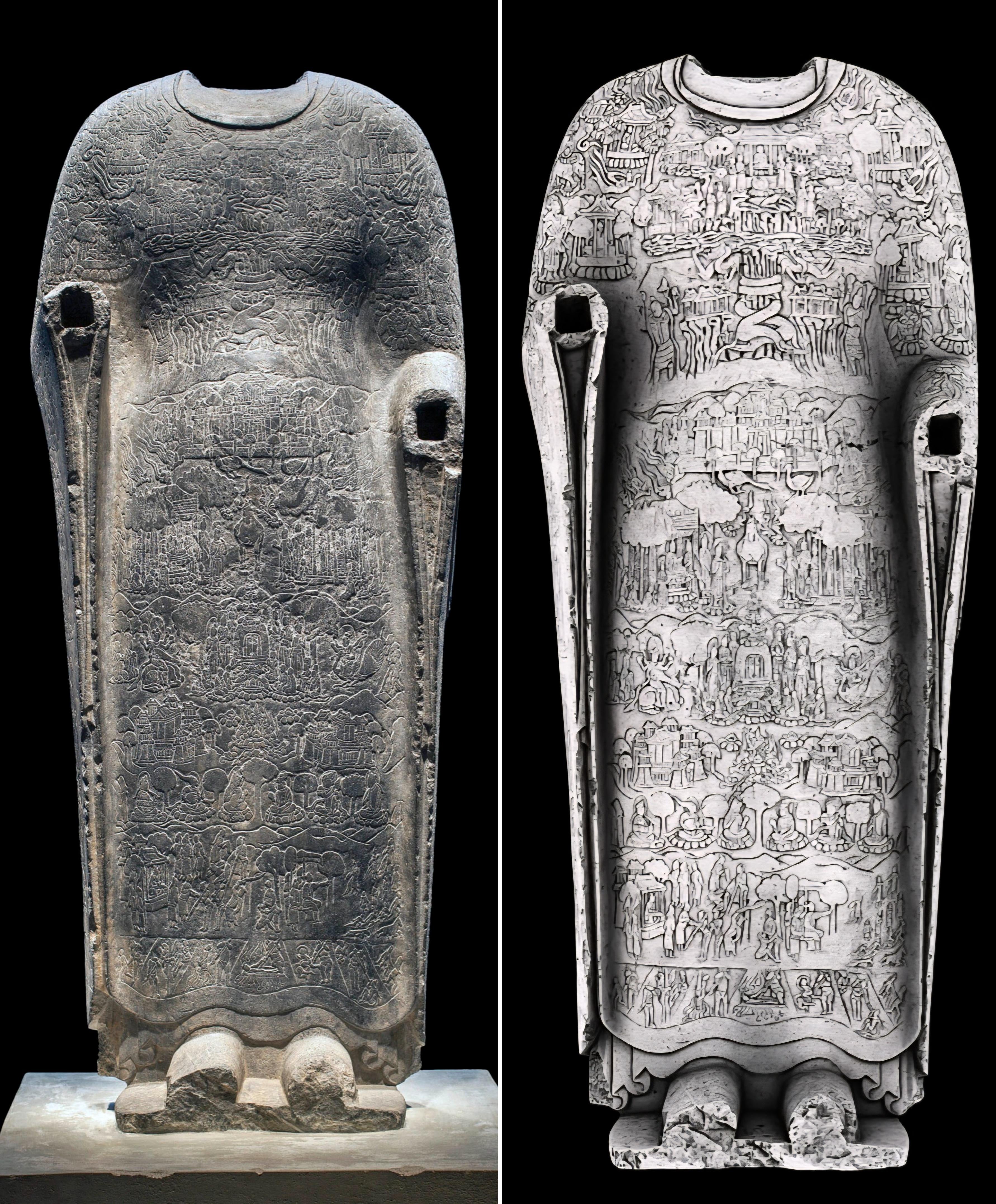 A limestone sculpture of the Cosmic Buddha Vairochana draped in robes portraying the Realms of Existence. Northern Qi dynasty, 550–577 CE, from China, now housed at the National Museum of Asian Art in Washington, D.C. [3564×4308]