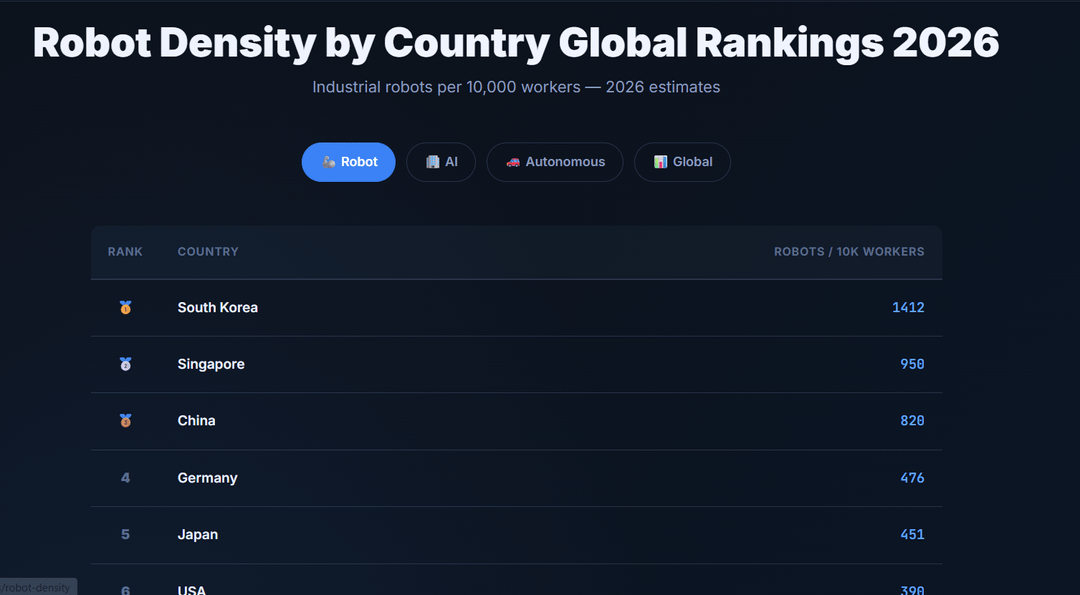 • South Korea leads at 1,412 robots/10k workers, followed by Singapore (950) and China (820)