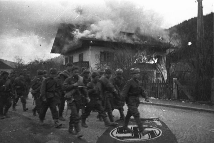 Soviet troops trample a Nazi flag as they march past a burning house on a street in the outskirts of Vienna, Austria, April 1945 [700×467] by Rosemarry_40