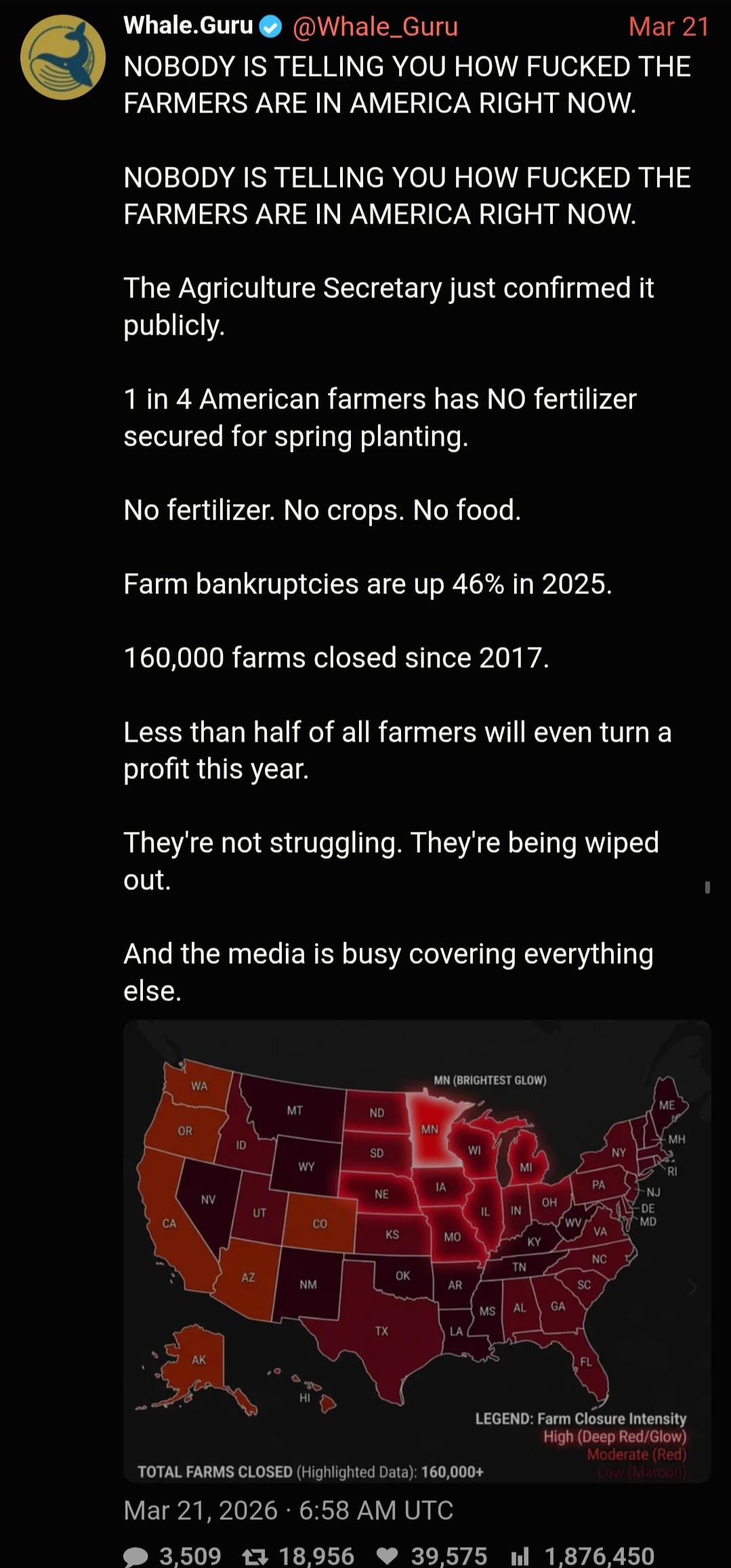 This is the problem with having wealthy people in charge. If their policies bankrupt ⅓ of all farmers. To them, that just means they can make great deals buying up land