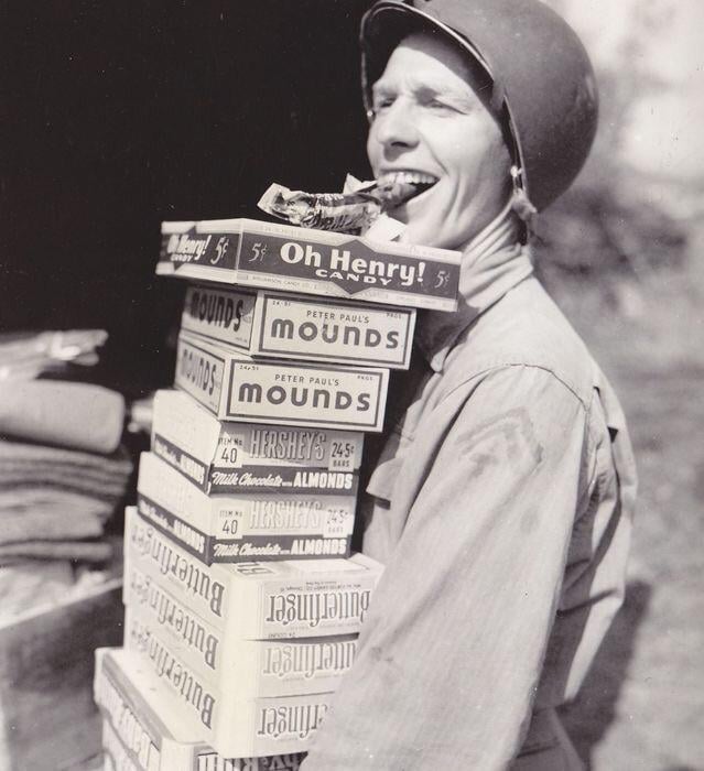 Happy GI on his way to pass out candy rations to his buddies, ca 1944. [639×700]
