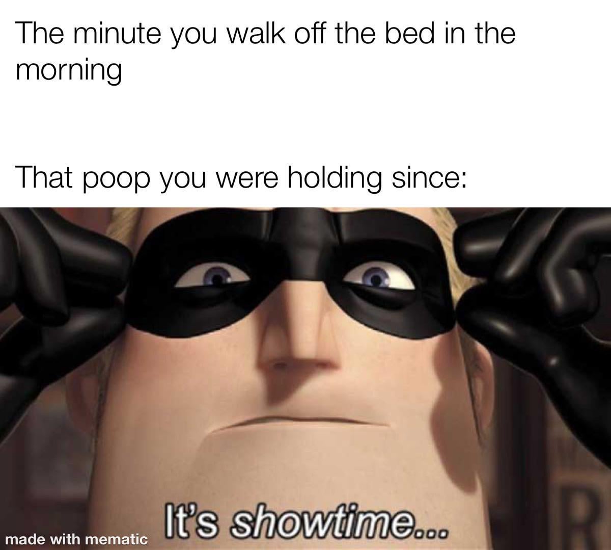 I dont walk off the bed and i sure as hell dont hold my poop at home especially not before bed