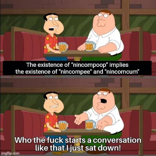 Except it literally doesn’t. The existence of “nincompoop” implies the existence of “poop”, because it’s a determinative composite noun that semantically refers to a proper subset. It works like an adjective in that way. For an analogy, the existence of chunky poop doesn’t imply the existence of chunky pee and chunky cum either. Source: linguist.