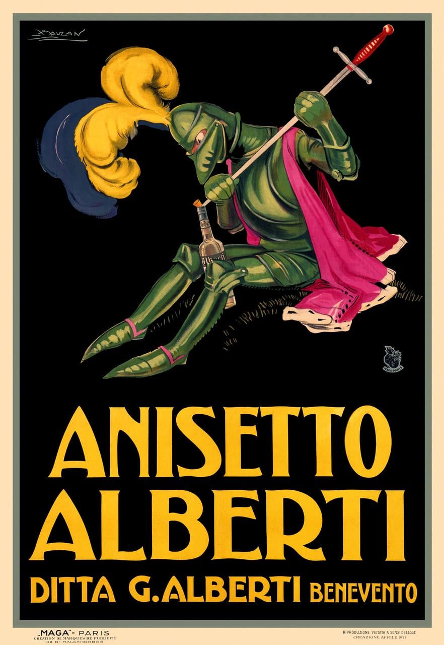 Ad for the Anisetto Alberti, an Italian anise-flavored liqueur, made by Achille Lucien Mauzan (1883-1952), 1921