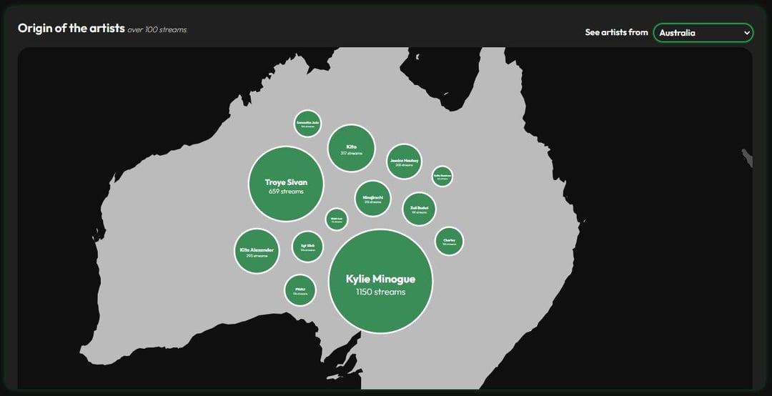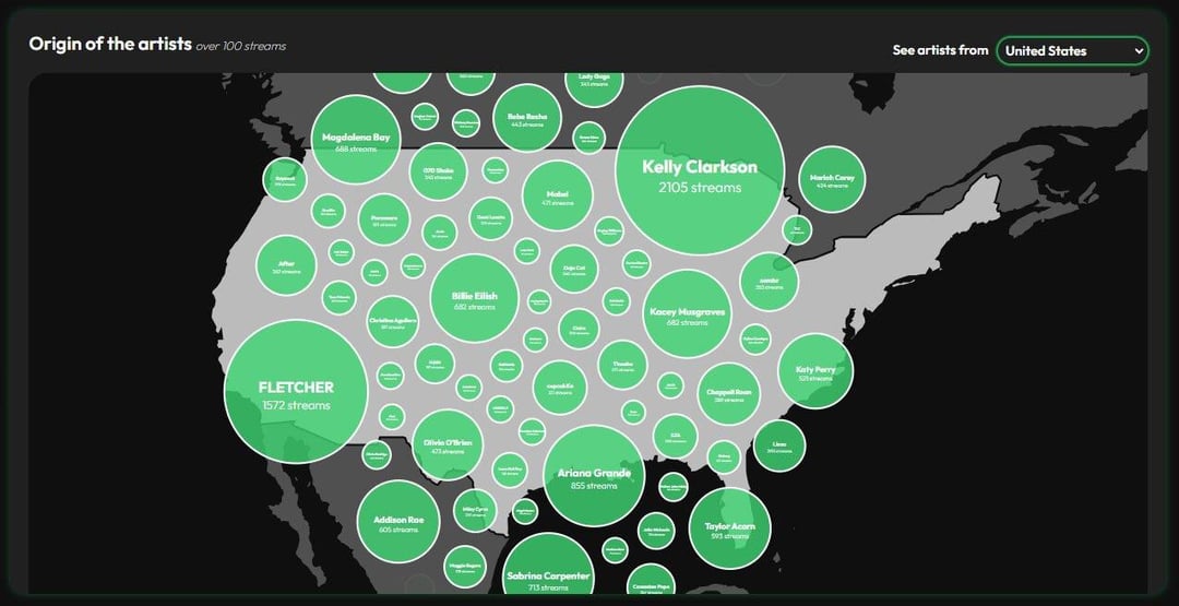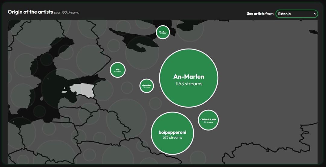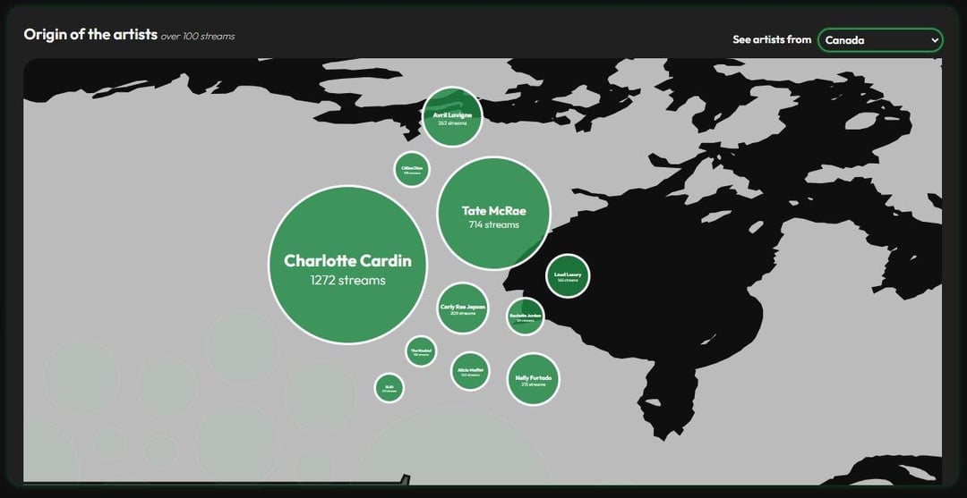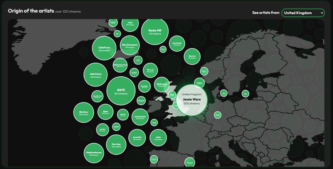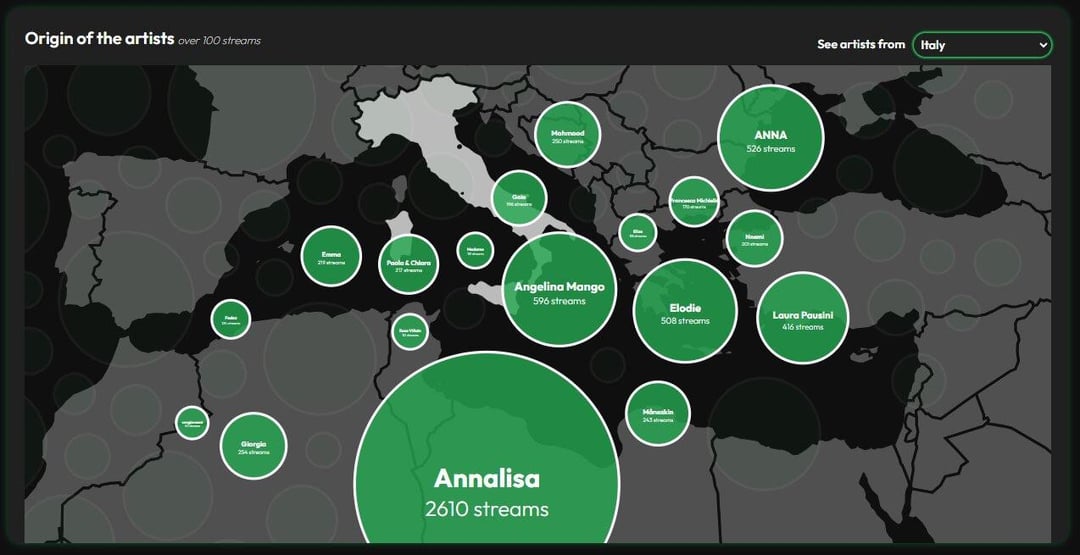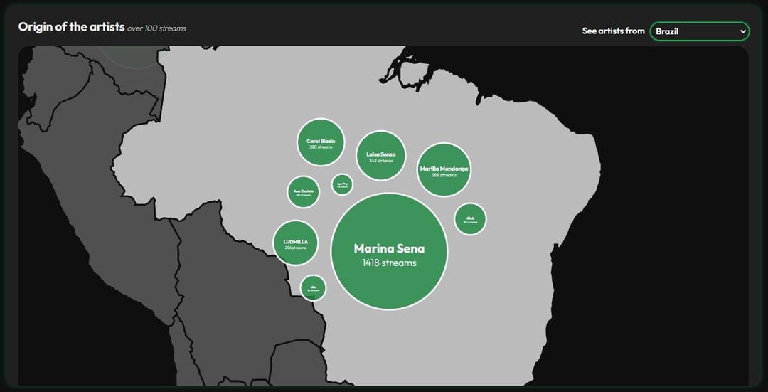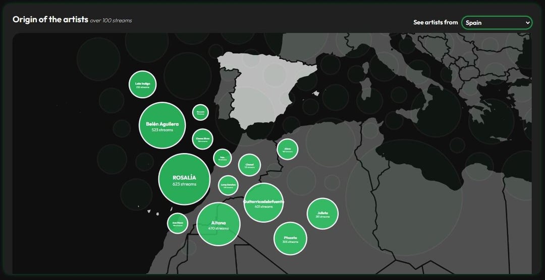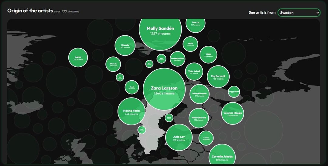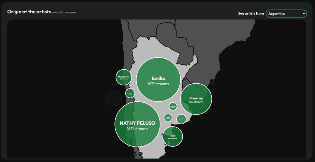 Bubble map showing the origin of artists with more than 100 streams. Users can select a country to view artists from that country.