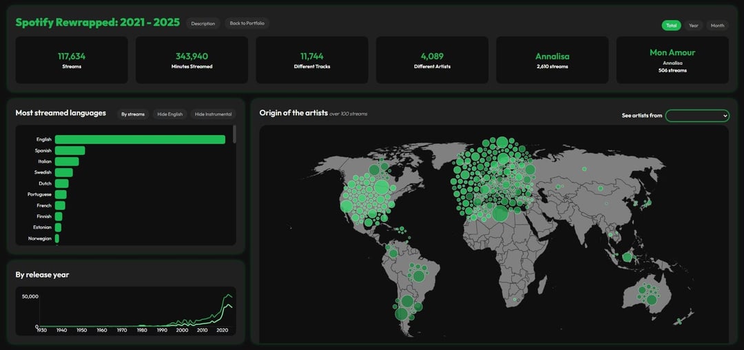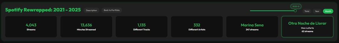 I created a few visualizations using my Spotify streaming history from 2021 to 2025, built with R and Svelte (HTML + JavaScript). The dashboard includes: