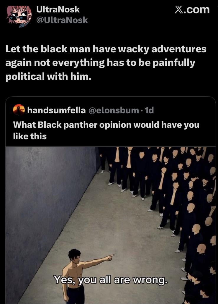 The Black Panther fandom is sick of the “what if what if what iffffff T’Challa loses everything and his elite forces are somehow at the root of that loss because they echo the people who think T’Challa is a horrible king” storylines. It has happened three separate times now and every single time they walk it back. Yes T’Challa is black and a king in a world that fears him and he needs to think about every move he makes, but, he is a six foot tall super powered martial artist wearing a cat suit and can talk to spirits. Give him some JJBA.