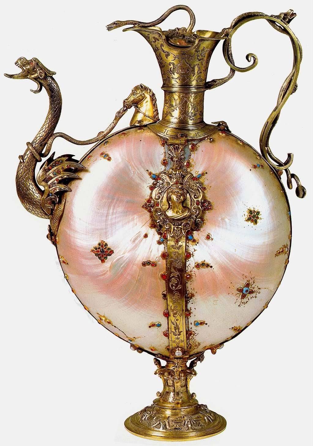 An ewer with double nautilus, mounted in silver gilt, and adorned with mother-of-pearl, rubies, and turquoises. Circa 1590 CE, now housed in the Silver Museum at the Palazzo Pitti in Florence, Italy [1023×1456]