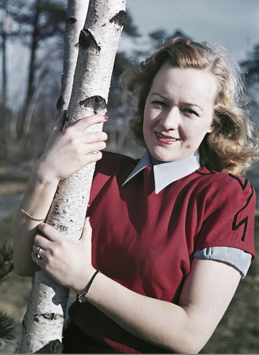 Norwegin lady posing against a tree, Circa 1943. Agfachrome shot.