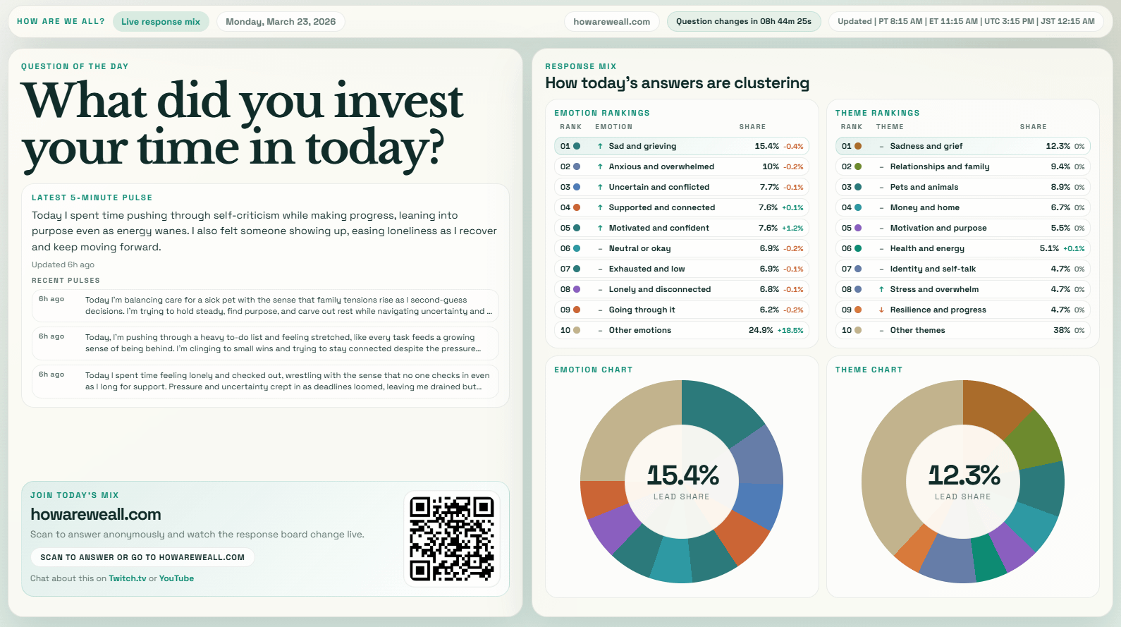 Processing: Responses grouped into themes and emotions using a custom clustering approach, then aggregated into percentage shares