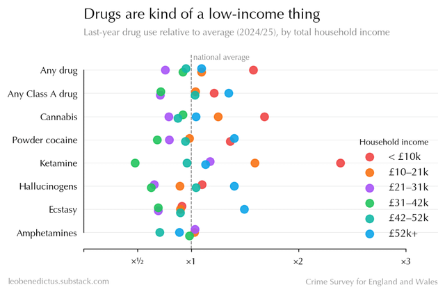 Your last slide claims that drugs are a low income “thing” but your own results show that it more accurate to say there is a dip between those earning ~£30-50K, with those earning more are just as likely if not more likely to use certain drugs then those earning under £20k.