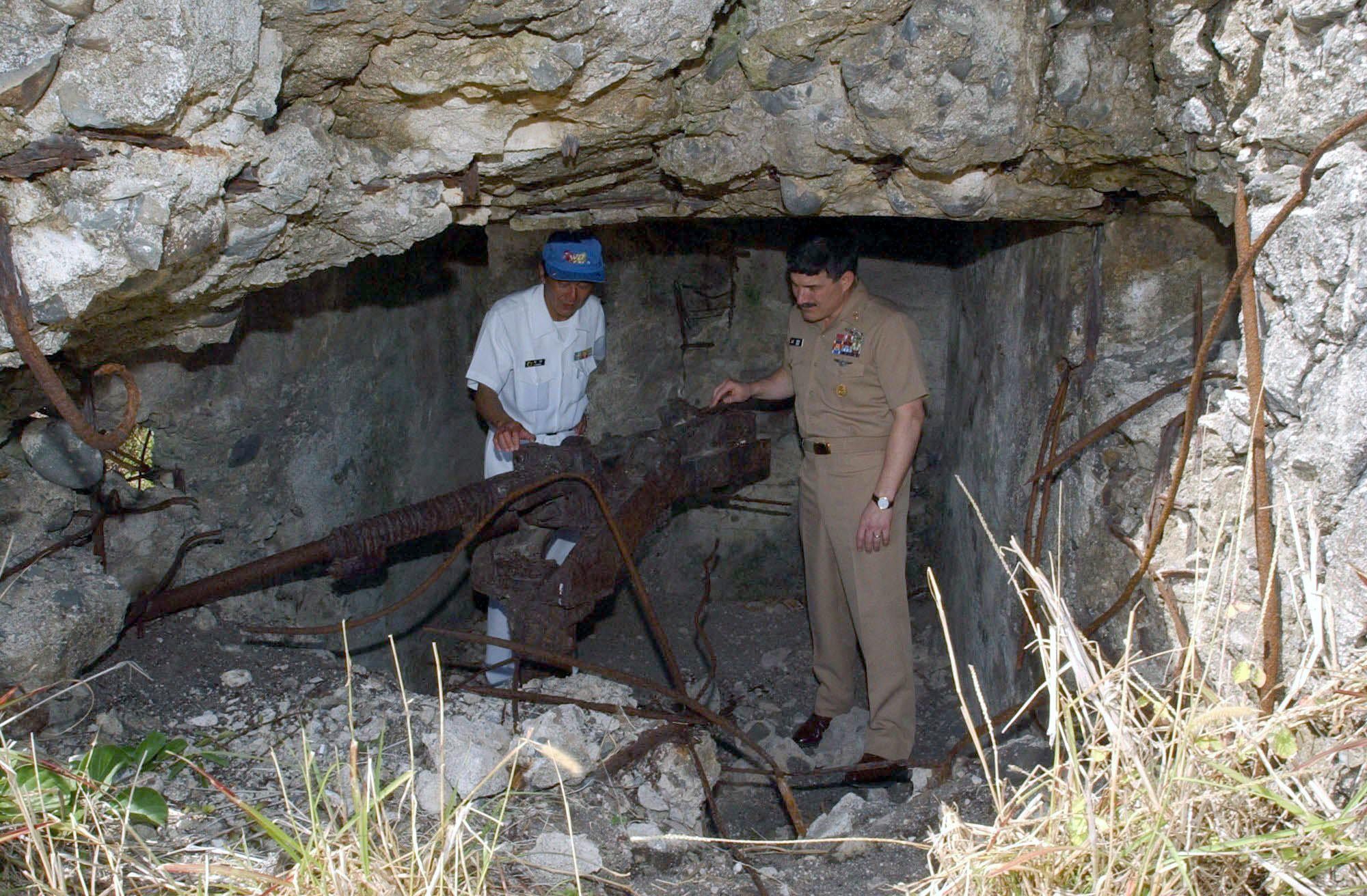 U.S. Navy Master Chief Petty Officer (MCPO), Terry Scott looking at a Japanese Type 96 (25mm) anti-aircraft and anti-tank cannon – in a small cave on the island of Iwo Jima, Japan, c. March 23rd, 2003. [2000 x 1312]