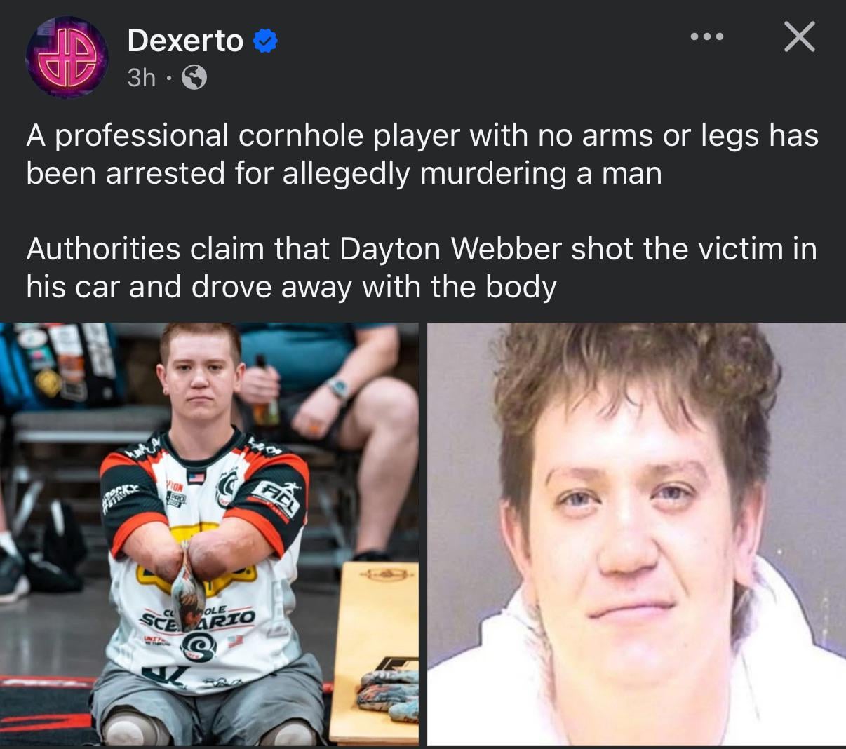 Police have not explained how Webber was able to drive a car or fire a weapon. “ – https://www.fox5dc.com/news/quadruple-amputee-professional-cornhole-player-faces-murder-charges